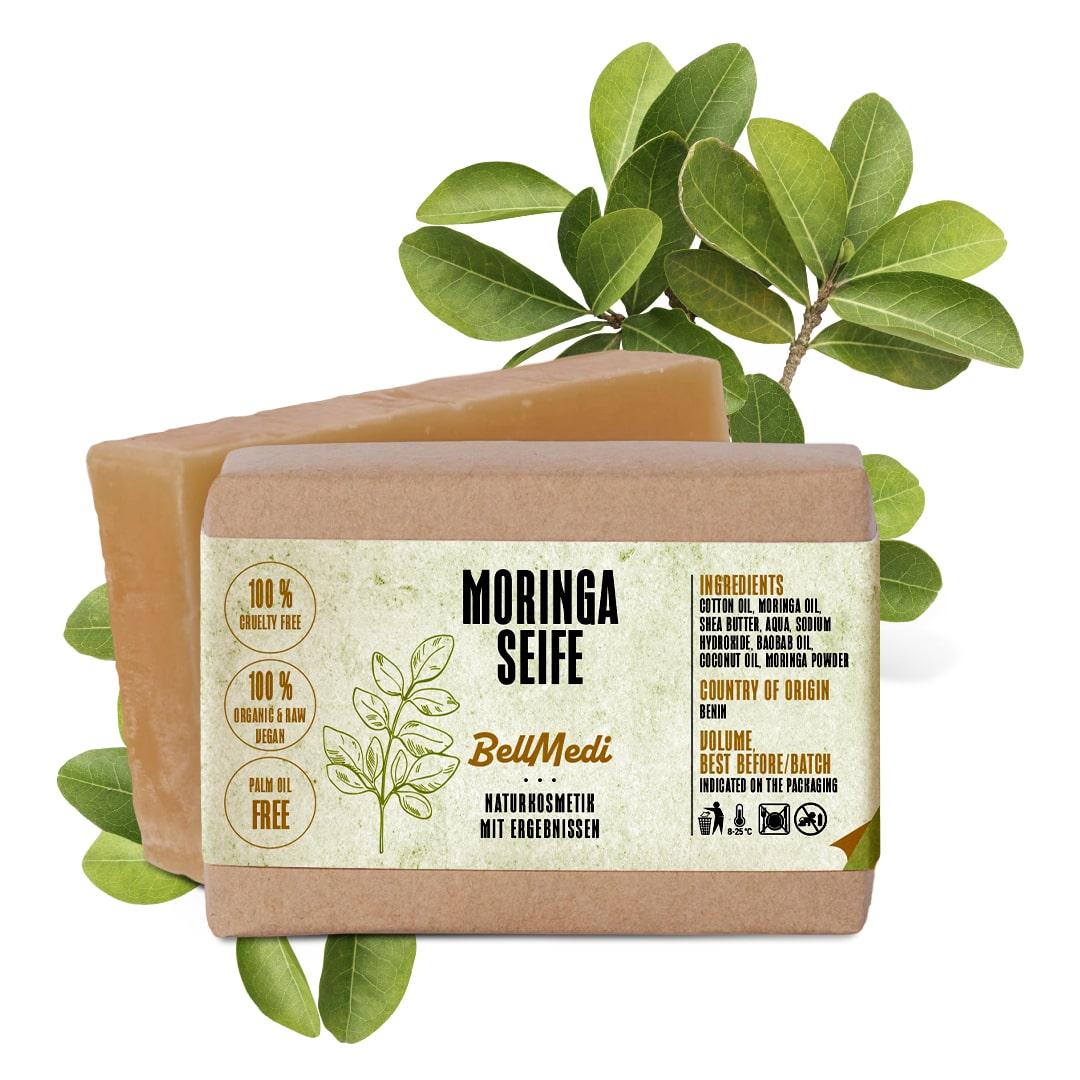 Dank des natürlichen Dufts der Moringa und des enthaltenen Moringaöls aus den Samen reinigt und pflegt die Seife die Haut besonders schonend. Sie wird aus hochwertigen, 100 % natürlichen Inhaltsstoffen hergestellt und enthält einen der wirksamsten natürlichen Antioxidantien – Moringaöl, das für seine schützenden und regenerierenden Eigenschaften bekannt ist.