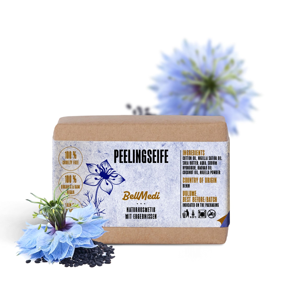 Die Peelingseife ist eine 100 % natürliche Seife mit Schwarzkümmel (Nigella sativa), die für die tägliche Reinigung von Gesicht, Händen und Körper mit einem sanften Peelingeffekt entwickelt wurde. Sie ist für alle Hauttypen geeignet, besonders jedoch für Mischhaut, problematische und fahle Haut mit Neigung zu Akne und verstopften Poren.